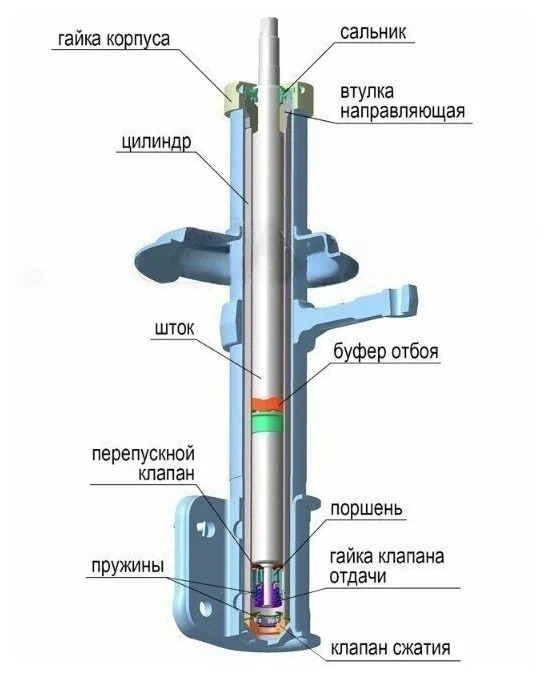 Независимо от типа амортизатора в его конструкции присутствуют: