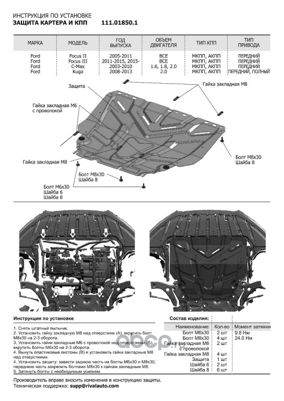 Расширенное описание: Защита картера и КПП АвтоБроня для Ford C-Max I (V - 1.6; 1.8; 2.0) 2003-2010/Ford Focus II (V - все) 2005-2019/Ford Grand C-Max II (V - 1.6) 2010-2015/Ford Kuga I (V - 2.0D) 2008-2013, штампованная, сталь 1.5 мм, с крепежом, 111.01850.1