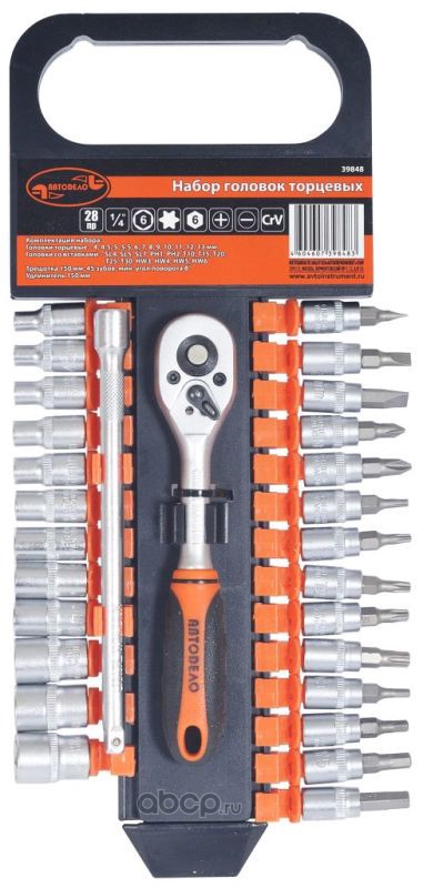 Расширенное описание: • Комплектация набора оптимизирована для использования как в автомобиле, так и в быту.• Набор укомплектован инструментом с присоединительным квадратом 1/4".• Инструмент закалён до твёрдости не менее 39 HRC и защищён от коррозии хромированием с эффектом матовой поверхности.• Упаковка - пластиковый держатель.Комплектация набора:Головки торцевые: 4, 4,5, 5, 5,5, 6, 7, 8, 9, 10, 11, 12, 13 мм;Головки со вставками шлицевыми: SL4, SL5, SL7;Головки со вставками Phillips: РН1, РН2;Головки со вставками Torx: Т10, Т15, Т20, Т25, Т30;Головки со вставками шестигранными: 3, 4, 5, 6 мм;Ключ трещоточный: 150 мм (39727); Удлинитель прямой: 150 мм (39763).