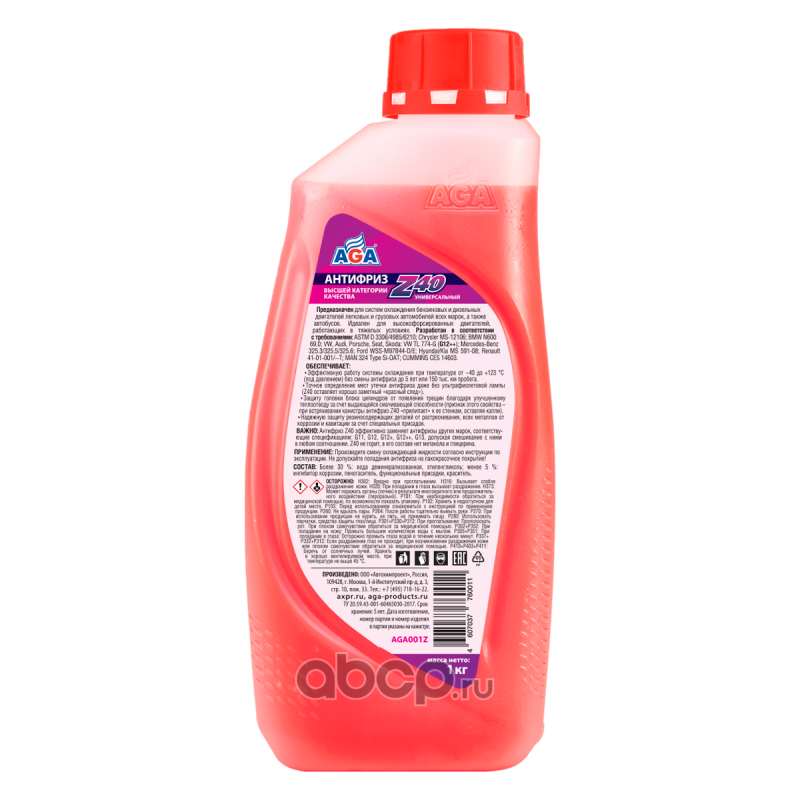 Антифриз AGA-Z40/G12++, 1 кгНазначениеУниверсальный антифриз. Предназначен для систем охлаждения бензиновых и дизельных двигателей легковых и грузовых автомобилей всех марок, а также автобусов. Идеален для высокофорсированных двигателей, работающих в тяжелых условиях с высокими силовыми нагрузками (движение по пересеченной или горной местности, буксировка прицепа и т. п.). СпецификацииРазработан в соответствии с требованиями: ASTM D 3306/4985/6210; Chrysler MS-12106; BMW N600 69.0; VW, Audi, Porsche, Seat, Skoda: VW TL 774-G (G12++); Mercedes-Benz 325.3/325.5/325.6; Ford WSS-M97B44-D/E; Hyundai/Kia MS 591-08; Renault 41-01-001/--T; MAN 324 Type Si-OAT; CUMMINS CES 14603 СовместимостьДопускается смешивать в любом соотношении с антифризами класса «–40 °С» других марок, соответствующими спецификациям: G11, G12, G12+, G12++, G13. Срок службы: до 5 лет, или 150 000 км пробега.Рабочий температурный диапазон: от –40 до +123 °C.Воспламеняемость:Не горит, в составе нет метанола и глицерина.Технологическая основа производства антифриза: Адаптивная Z-технология.Индивидуальные отличительные свойства- Обладает свойством автодиагностики – позволяет определить место утечки даже без ультрафиолетовой лампы, оставляя хорошо заметный ""красный след"". - Антифриз AGA-Z40 глубоко проникает в микрорельеф омываемой поверхности, что существенно улучшает теплоотвод, исключает образование локальных зон перегрева в головке блока цилиндров и образование в ней трещин, предотвращая выход двигателя из строя, что особенно важно в случае большой силовой нагрузки на двигатель при невысокой интенсивности циркуляции охлаждающей жидкости (обороты коленчатого вала ниже 3000 об/мин). Отличается выдающейся смачивающей способностью. Повышенная смачивающая способность демонстрируется путем взбалтывания канистры – антифриз Z40 долго стекает с ее стенок. СОСТАВ: Более 30 %: вода деминерализованная, этиленгликоль; менее 5 %: ингибитор коррозии, пеногаситель, функциональные присадки, краситель.