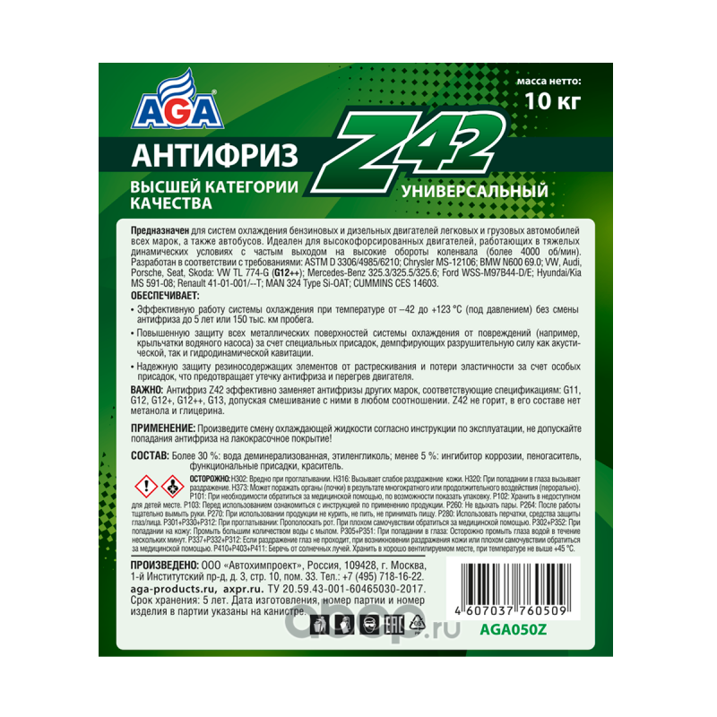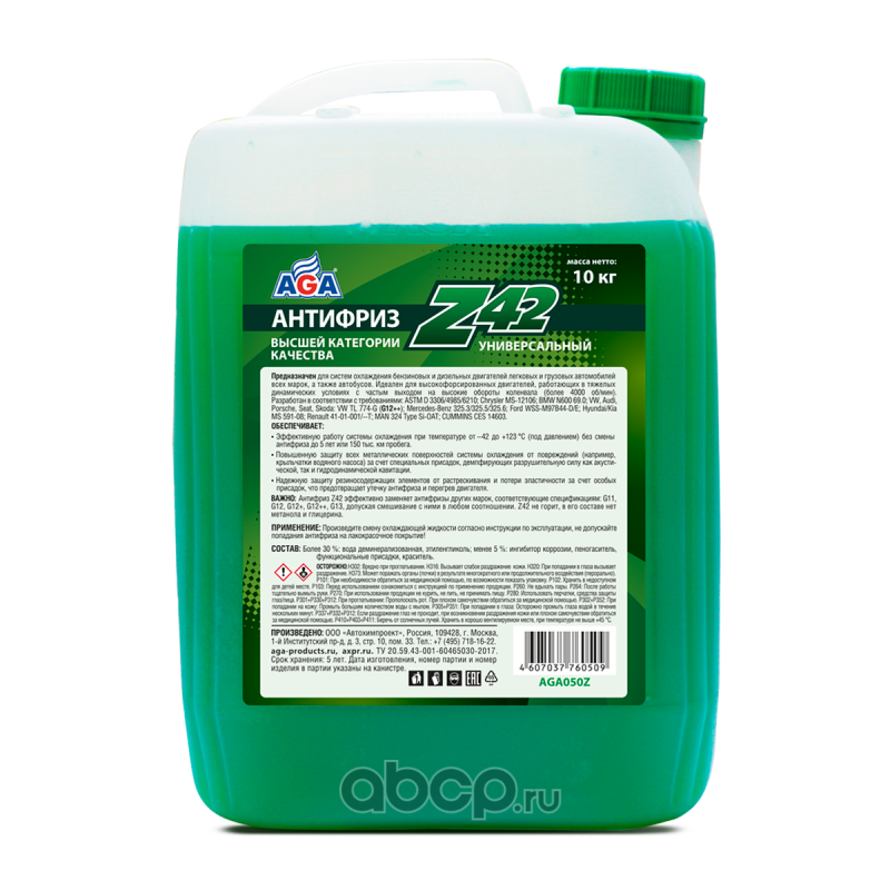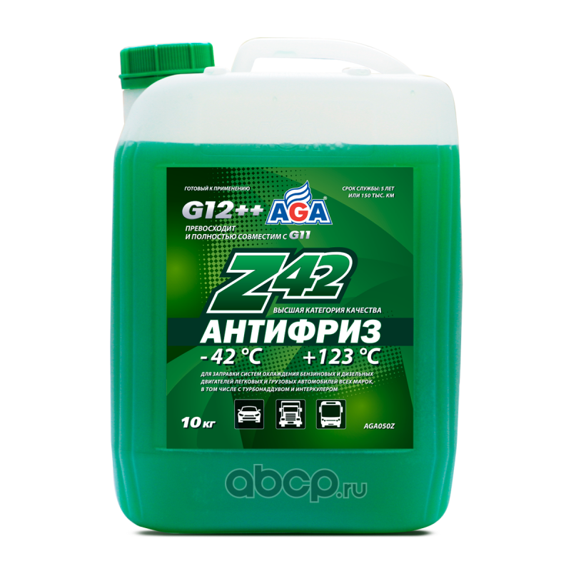 Антифриз AGA-Z42/G12++, 10 кг Назначение: Универсальный антифриз. Предназначен для систем охлаждения бензиновых и дизельных двигателей легковых и грузовых автомобилей всех марок, а также автобусов. Идеален для высокофорсированных двигателей, работающих в тяжелых динамических условиях с частым выходом на высокие обороты коленчатого вала, например, более 4000 об/мин (спортивный стиль вождения, ралли, интенсивный городской цикл). Спецификации: Разработан в соответствии с требованиями: ASTM D 3306/4985/6210; Chrysler MS-12106; BMW N600 69.0; VW, Audi, Porsche, Seat, Skoda: VW TL 774-G (G12++); Mercedes-Benz 325.3/325.5/325.6; Ford WSS-M97B44-D/E; Hyundai/Kia MS 591-08; Renault 41-01-001/--T; MAN 324 Type Si-OAT; CUMMINS CES 14603 Совместимость: Допускается смешивать в любом соотношении с антифризами других марок, соответствующими спецификациям: G11, G12, G12+, G12++, G13. Срок службы: до 5 лет, или 150 000 км пробега. Рабочий температурный диапазон: от –42 до +123 C. Воспламеняемость: не горит, в составе нет метанола и глицерина. Технологическая основа производства антифриза: адаптивная Z-технология. Индивидуальные отличительные свойства: Обеспечивает особую (повышенную) защиту всех металлических поверхностей системы охлаждения от кавитации. Антифриз содержит специальные присадки, которые ""прилипают"" к металлическим поверхностям и демпфируют разрушительную силу ударной волны, возникающей вследствие схлопывания газовых пузырьков в антифризе при акустической и гидродинамической кавитации. Надежно защищает все резиносодержащие элементы системы охлаждения от растрескивания и набухания, что предотвращает выход двигателя из строя вследствие утечки антифриза из-за разрушения резиновых патрубков и шлангов. Специальные присадки осаждаются на внутренней поверхности резиносодержащих элементов и поддерживают их эластичность, защищая от старения и растрескивания. Увеличение оборотов коленвала вызывает повышение интенсивности циркуляции охлаждающей жидкости и, соответственно, скорости ее течения по каналам системы охлаждения. Это условие способствует возникновению разрушительного физического явления – кавитации. Антифриз AGA-Z42 обладает самым высоким потенциалом антикавитационной защиты благодаря применению специальных присадок.СОСТАВ: Более 30 %: вода деминерализованная, этиленгликоль; менее 5 %: ингибитор коррозии, пеногаситель, функциональные присадки, краситель.