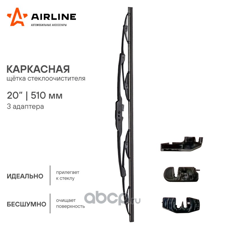 Расширенное описание: Щетка стеклоочистителя 500 мм (20"") каркасная, 3 адаптера