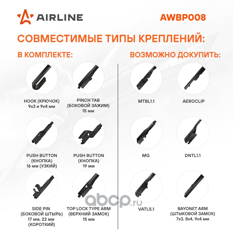 Крепление: j-hook (крючок), pinch tab (боковой зажим), push button (кнопка) 19мм, side pin (боковой штырь) 22мм, top lock (верхний замок)