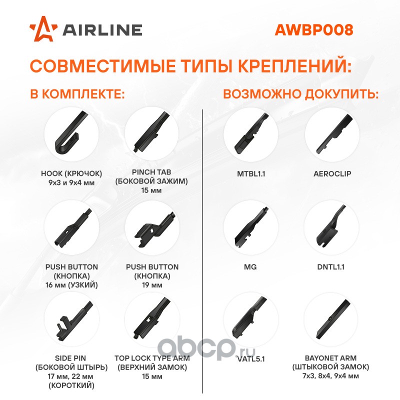 Крепление: j-hook (крючок), pinch tab (боковой зажим), push button (кнопка) 19мм, side pin (боковой штырь) 22мм, top lock (верхний замок)