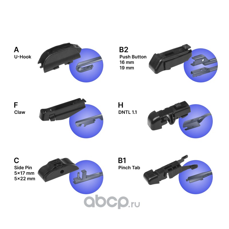 Крепление: bayonet (штыковой замок), j-hook (крючок), pinch tab (боковой зажим), push button (кнопка) 19мм, side pin (боковой штырь) 22мм, top lock (верхний замок)