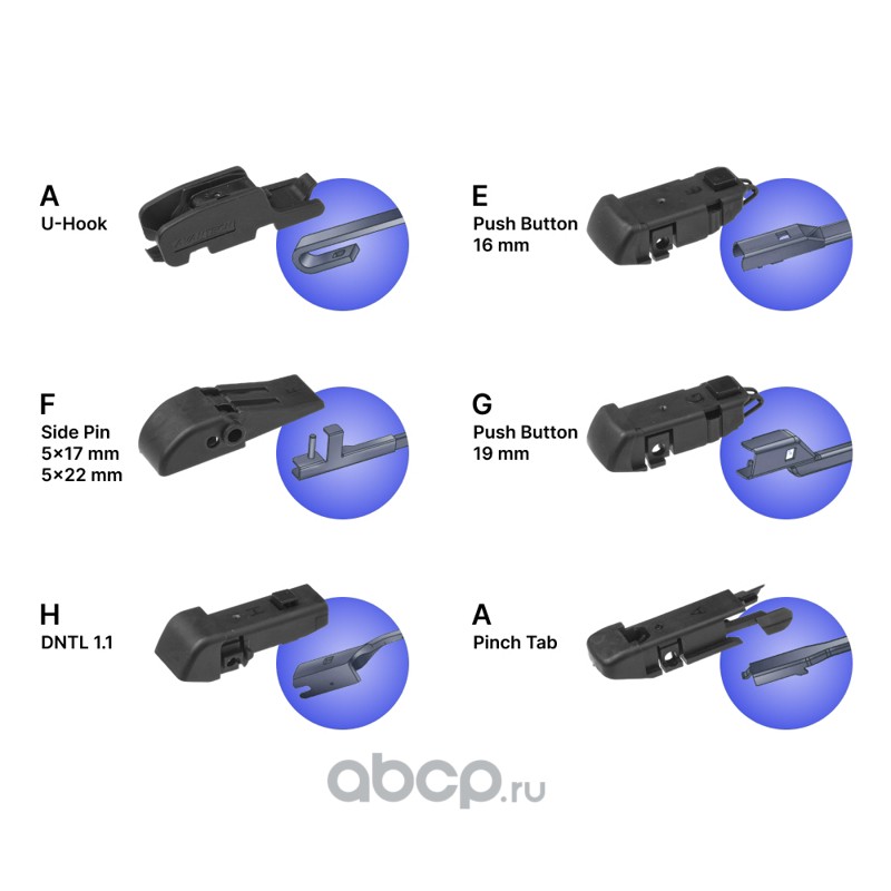 Крепление: bayonet (штыковой замок), j-hook (крючок), pinch tab (боковой зажим), push button (кнопка) 19мм, side pin (боковой штырь) 22мм, top lock (верхний замок)