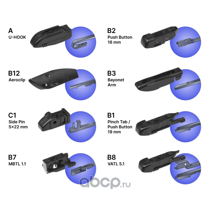 Крепление: AeroClip (АэроКлип), GWB045 (MBTL1.1), j-hook (крючок), pinch tab (боковой зажим), push button (кнопка) 19мм, side pin (боковой штырь) 22мм