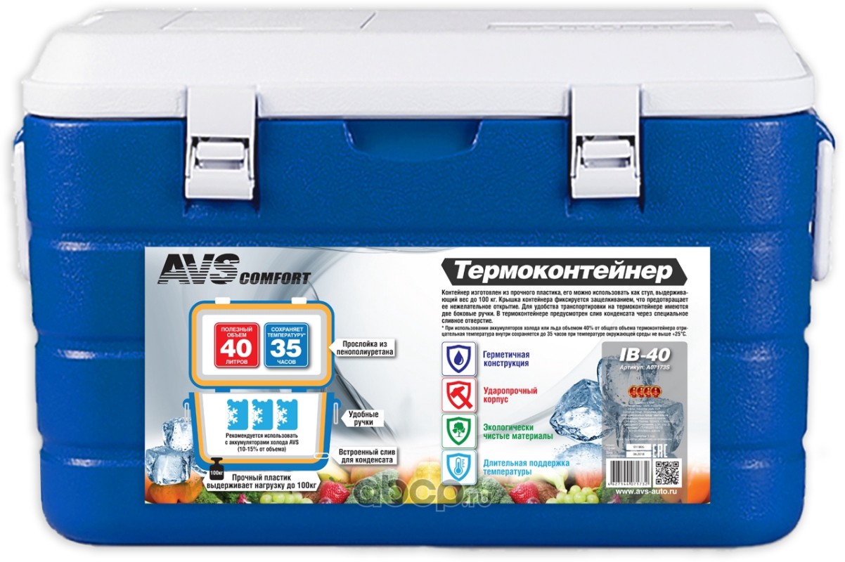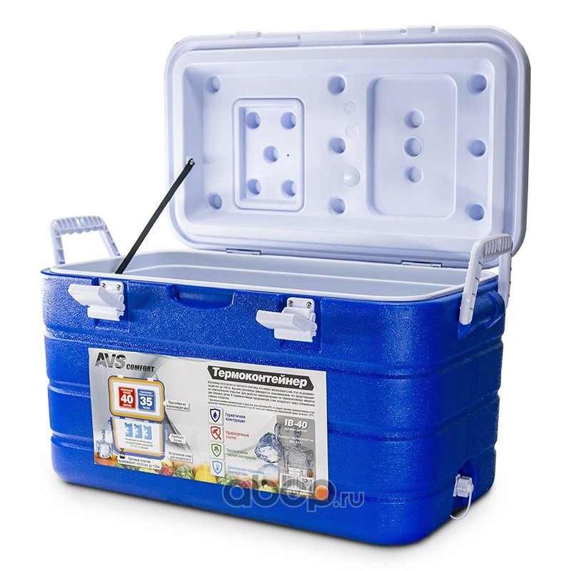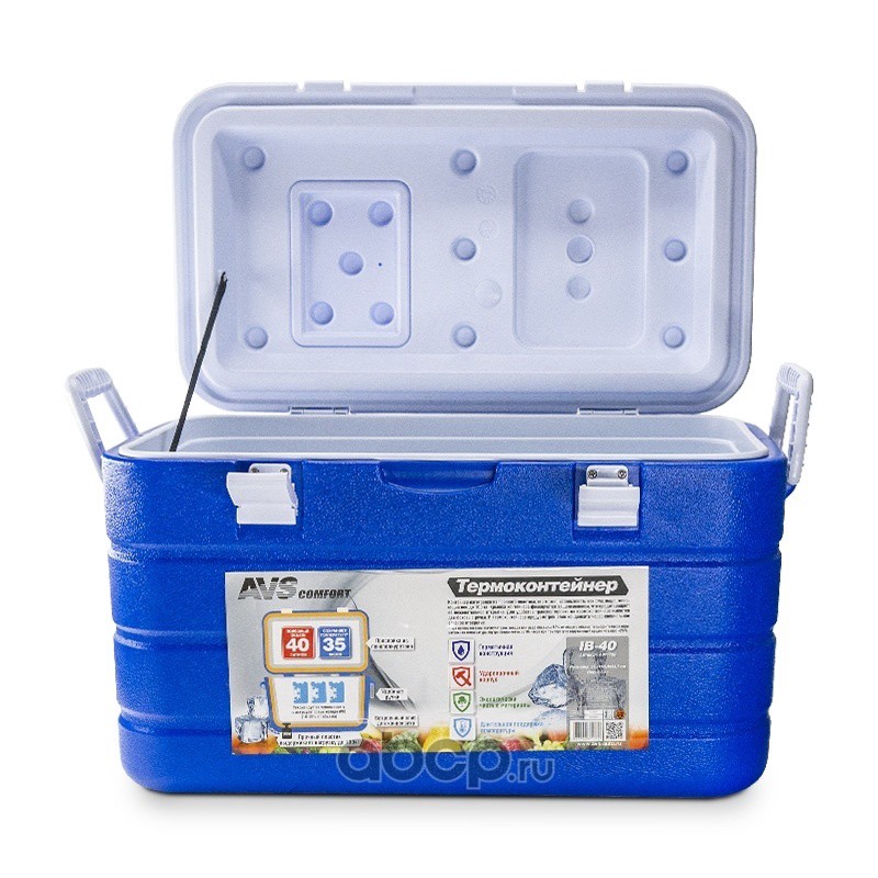 Характеристики •Объем: 40 литров •Размер внешний (см): 35,4(Г)*63,4(Ш)*34,7(В) •Размер внутренний (см): 28,8(Г)*55,3(Ш)*28,1(В) •Вес: 3,5 кг •Герметичная конструкция •Ударопрочный корпус •Экологически чистые материалы •Длительная поддержка температуры •Встроенный слив для конденсата •Прочный пластик выдерживает нагрузку до 100кг •Прослойка из пенополиуретана •Рекомендуется использовать с аккумуляторами холода AVS (10-15% от объема)