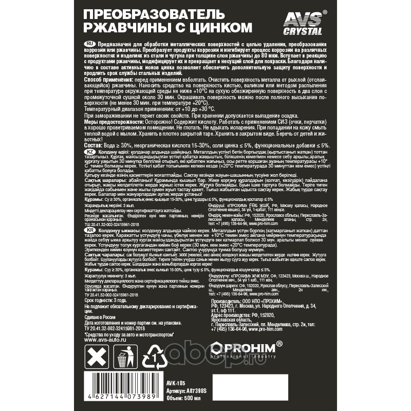 Предназначен для обработки металлических поверхностей с целью удаления, преобразования коррозии или ржавчины. Преобразует продукты коррозии и ингибирует процесс коррозии на различных поверхностях и изделиях из стали и чугуна при толщине слоя ржавчины до 80 мкм. Вступает в реакцию с продуктами ржавчины, модифицирует их и превращает в несущий слой для покраски. Благодаря наличию в составе активных ионов цинка позволяет обеспечить дополнительную защиту поверхности и продлить срок службы стальных изделий.