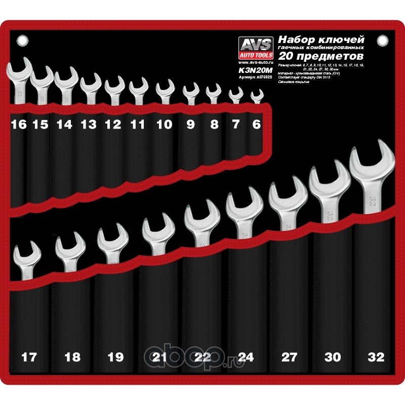 All World Cars - продажа Набор ключей гаечных комбинированных в сумке (6-32 мм) (20 предметов) AVS K3N20M артикул A07692S по всей России и странах СНГ. Развитая сеть представительств с быстрой доставкой товаров бренда AVS и гарантией выгодной цены. Покупая в AWC товар AVS каталожный номер A07692S вы бережете свое время, нервы и деньги.
