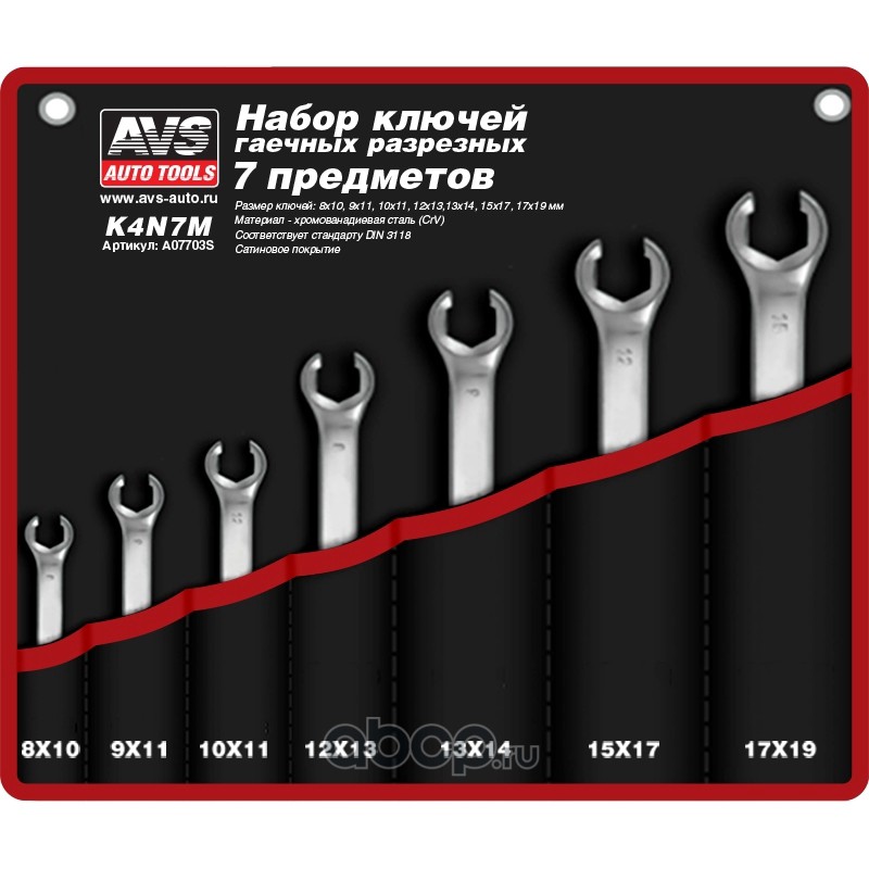 All World Cars - продажа Набор ключей гаечных разрезных в сумке (8-19 мм) (7 предметов) AVS K4N7M артикул A07703S по всей России и странах СНГ. Развитая сеть представительств с быстрой доставкой товаров бренда AVS и гарантией выгодной цены. Покупая в AWC товар AVS каталожный номер A07703S вы бережете свое время, нервы и деньги.