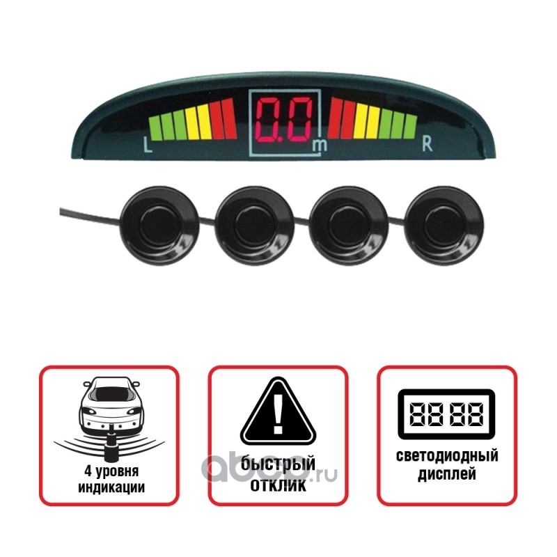 Парктроник PS-124U имеет четыре датчика черного цвета, индикатор и блок управления. Рекомендуется установка на задний бампер. Необходимо отметить способность парктроника одновременно информировать о наличии препятствия путем звукового и визуального оповещений, благодаря наличию информативного светодиодного индикатора и встроенного динамика звукового оповещения. Световая индикация сообщит о приближении к левому или правому препятствию, а звуковая и цифровая - о расстоянии до него.