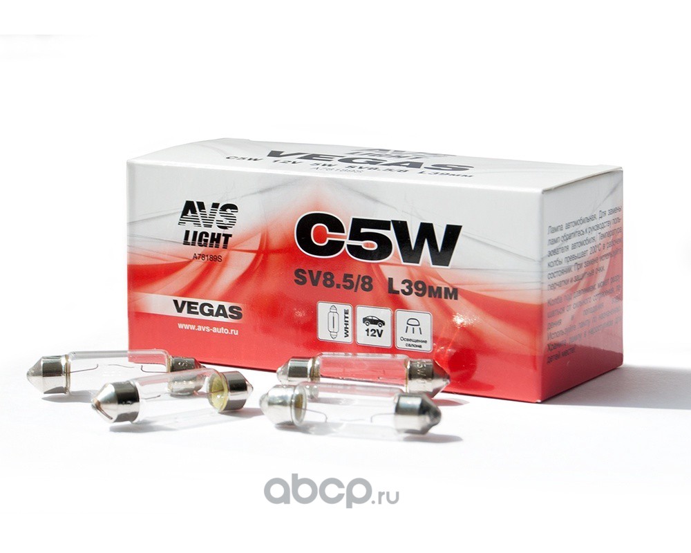 All World Cars - продажа Лампа AVS Vegas 12V.С5W(SV8.5/8)L39мм.BOX(10 шт.) артикул A78189S по всей России и странах СНГ. Развитая сеть представительств с быстрой доставкой товаров бренда AVS и гарантией выгодной цены. Покупая в AWC товар AVS каталожный номер A78189S вы бережете свое время, нервы и деньги.