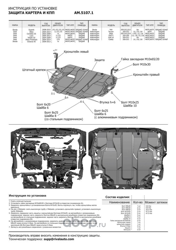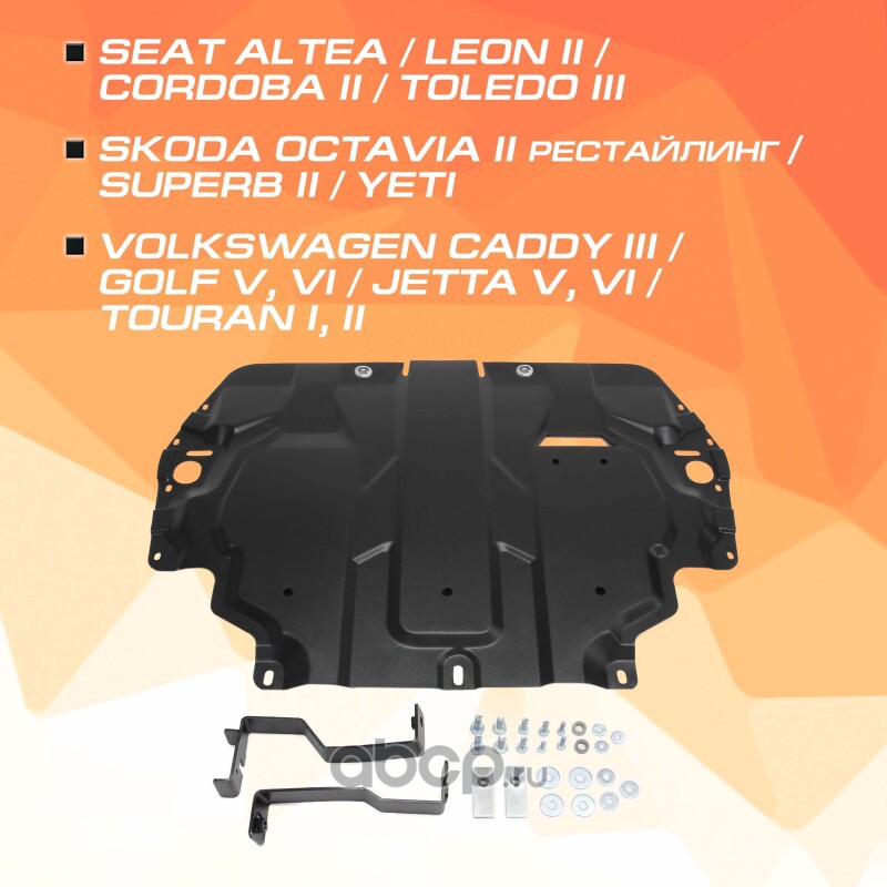 Расширенное описание: Защита картера и КПП AutoMax для Seat Altea (V - 1.6; 2.0; 2.0D) (вкл. Freetrack) 2004-2015/Seat Cordoba II (V - все) 2003-2009/Seat Leon II (V - 1.6; 2.0D) 2005-2012/Seat Toledo III (V - 1.6; 2.0D) 2004-2009/Skoda Octavia A5 рестайлинг (V - все) 2008-2013/Skoda Superb II (V - 1.4; 1.8; 2.0; 3.6) 2008-2015/Skoda Yeti (V - все) 2009-2018/Volkswagen Caddy III (V - 1.6; 1.9D; 2.0D) 2004-2010/Volkswagen Caddy III рестайлинг (V - 1.6; 2.0D) 2010-2015/Volkswagen Golf V (V - 1.6; 1.9D; 2.0; 2.0D) 2003-2009/Volkswagen Golf VI (V - все) 2008-2012/Volkswagen Jetta V (V - 1.4; 1.6; 1.9D) 2005-2010/Volkswagen Jetta VI (V - 1.4; 1.6) 2010-2019/Volkswagen Touran I (V - 1.6; 1.9D; 2.0D) 2003-2010/Volkswagen Touran II (V - 1.6; 2.0D) 2010-2015, сталь 1.4 мм, с крепежом, штампованная, AM.5107.1