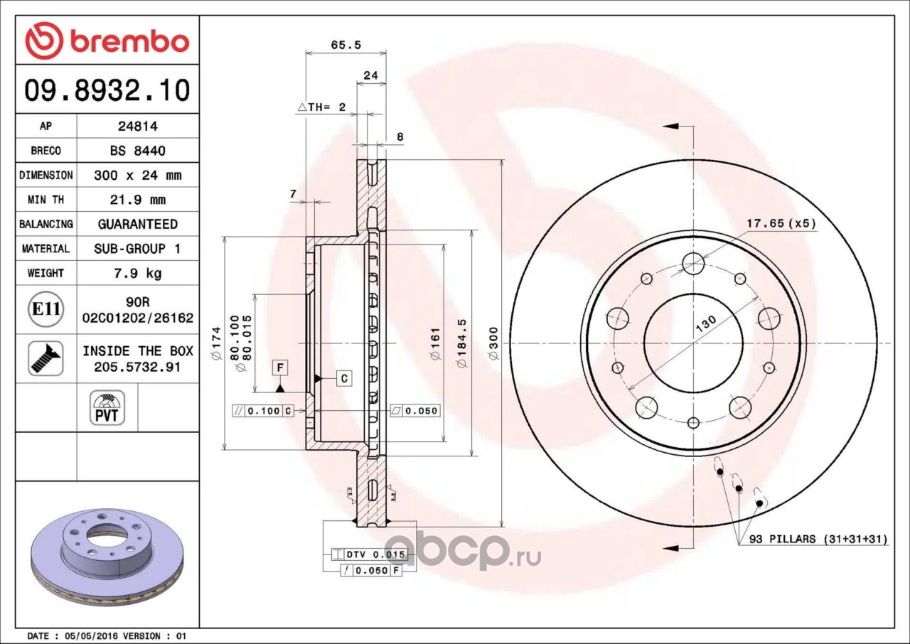 Расширенное описание: Тормозной диск , стандартный , вентилируемый с технологией PVT