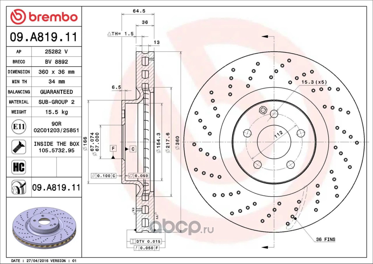 Диск тормозной передний перфорированный mb w211 s211 r230 r172 02 mb BREMBO 09.A819.11