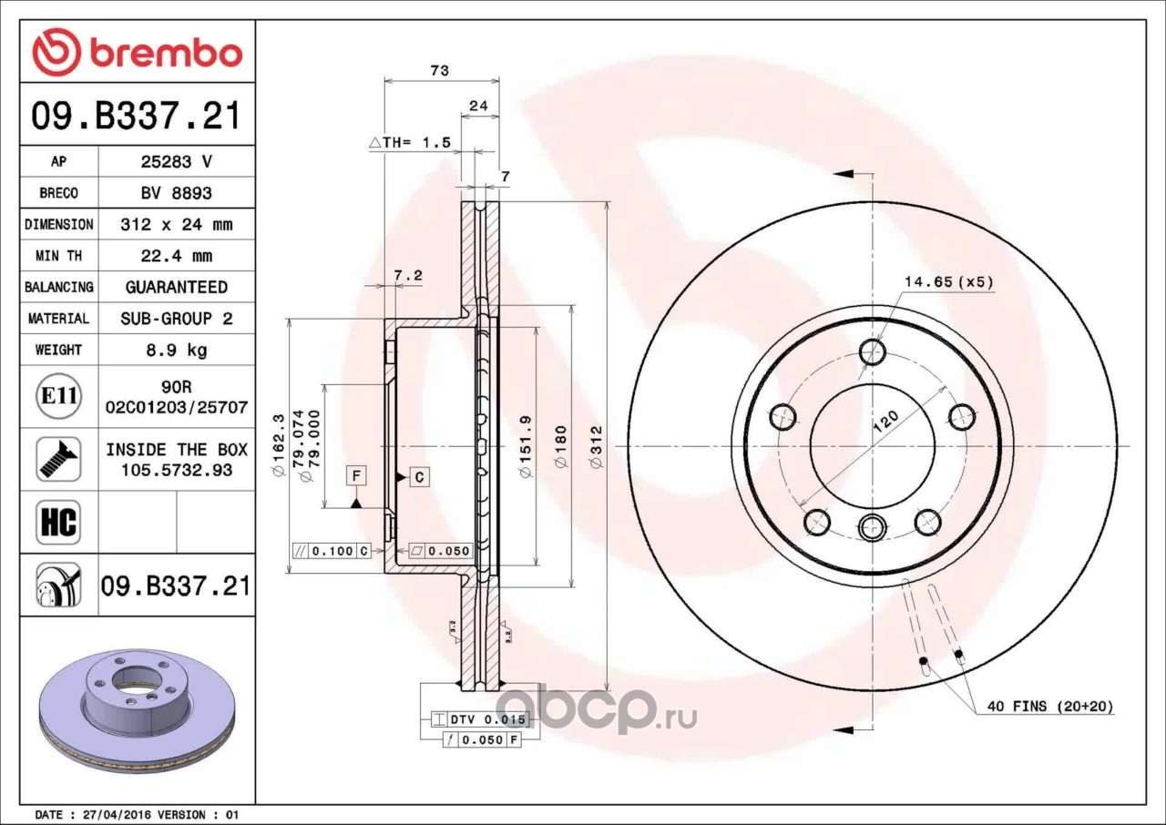 09.B337.21 ДИСК ТОРМОЗНОЙ ПЕРЕДНИЙ! С ПОКРЫТИЕМ BM