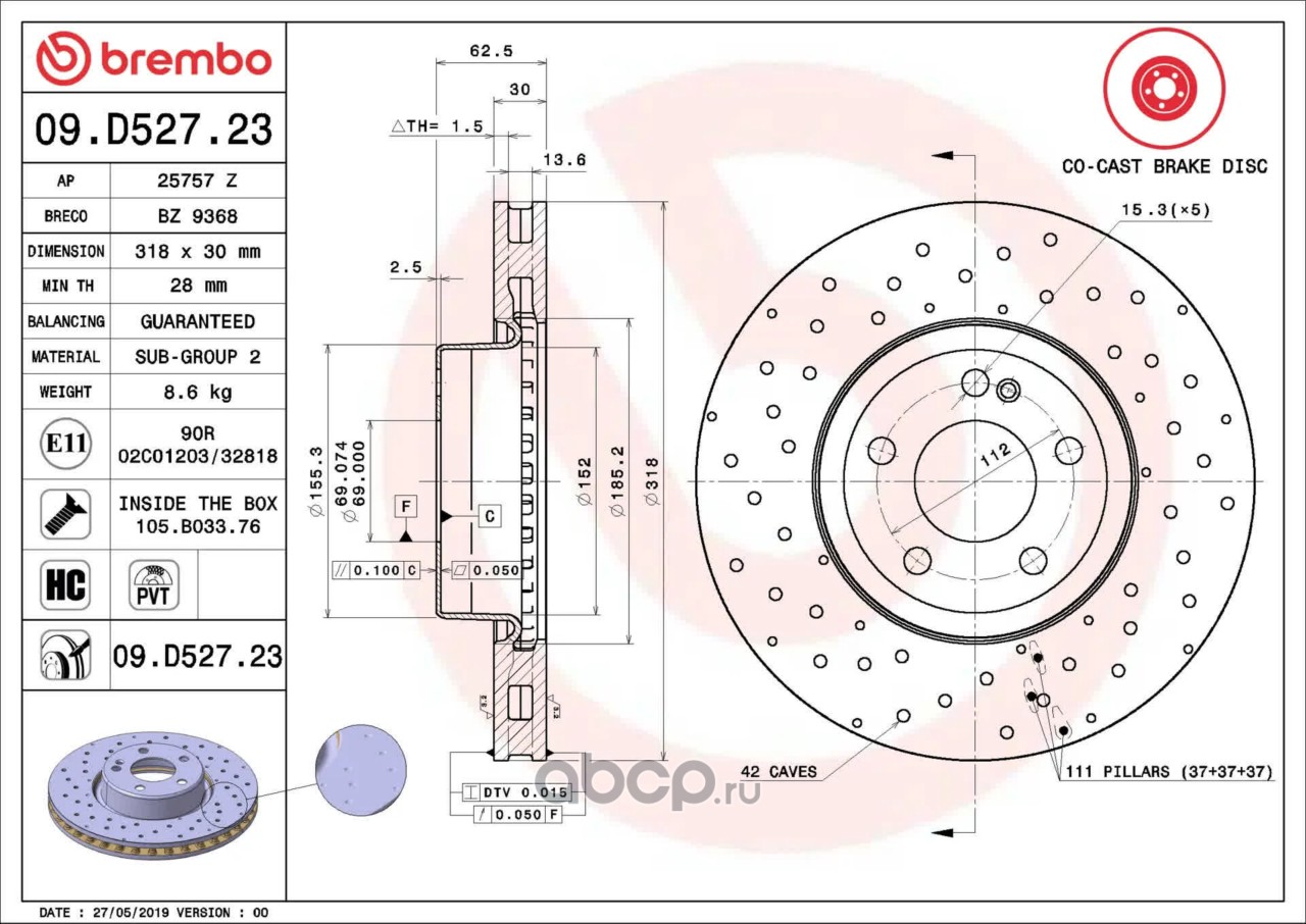 Расширенное описание: Тормозной диск , c технологией Co-cast , вентилируемый с технологией PVT , перфорированный