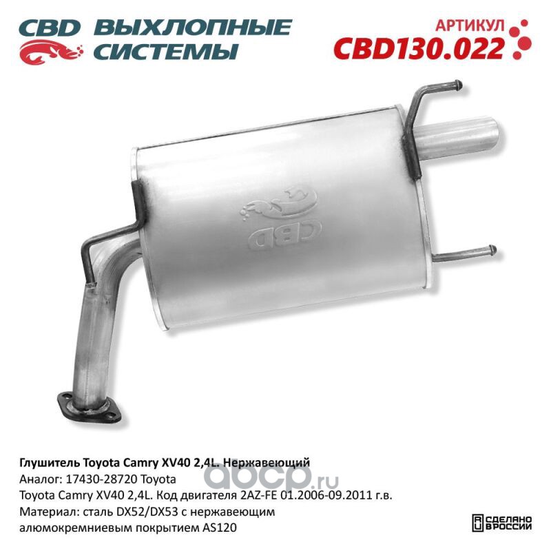 All World Cars - продажа Глушитель Toyota Camry XV40 2,4L 17430-28720 Нержавеющий. CBD130.022 артикул CBD130022 по всей России и странах СНГ. Развитая сеть представительств с быстрой доставкой товаров бренда CBD и гарантией выгодной цены. Покупая в AWC товар CBD каталожный номер CBD130022 вы бережете свое время, нервы и деньги.