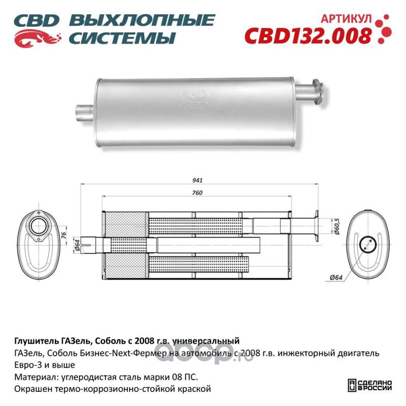 Расширенное описание: Глушитель универсальный ГАЗель/Соболь с 2008 г.в. CBD132.008