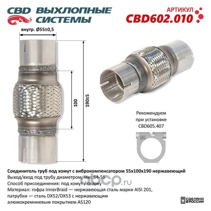Расширенное описание: Соединитель труб под хомут с виброкомпенсатором 55x100x190 Нерж сталь. CBD602.010