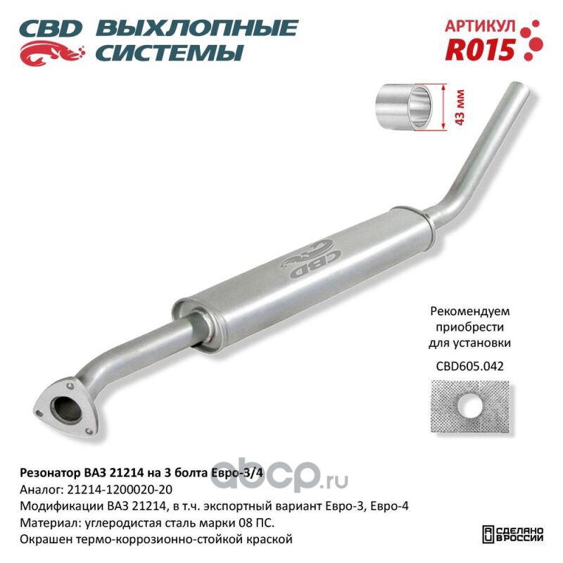All World Cars - продажа Резонатор ВАЗ 21214 Е-34 (креп на 3 болта) CBD артикул R015 по всей России и странах СНГ. Развитая сеть представительств с быстрой доставкой товаров бренда CBD и гарантией выгодной цены. Покупая в AWC товар CBD каталожный номер R015 вы бережете свое время, нервы и деньги.