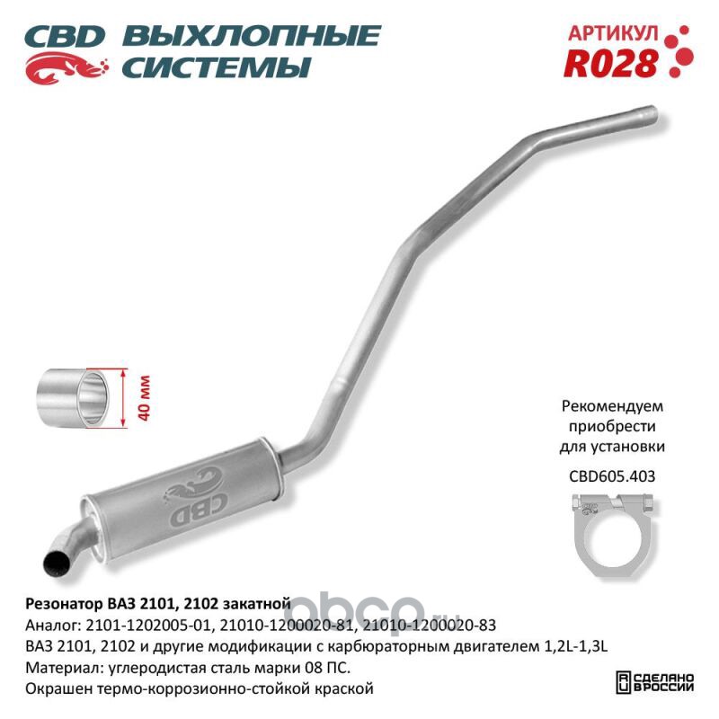 All World Cars - продажа Резонатор ВАЗ 2101, 2102 закатной. CBD. R028 артикул R028 по всей России и странах СНГ. Развитая сеть представительств с быстрой доставкой товаров бренда CBD и гарантией выгодной цены. Покупая в AWC товар CBD каталожный номер R028 вы бережете свое время, нервы и деньги.