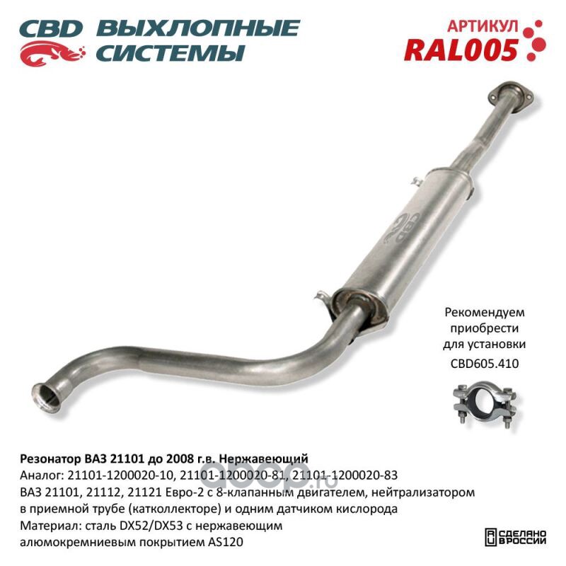 Расширенное описание: Резонатор ВАЗ 21101 до 08 г.в. Нерж cталь Е2. CBD. RAL005