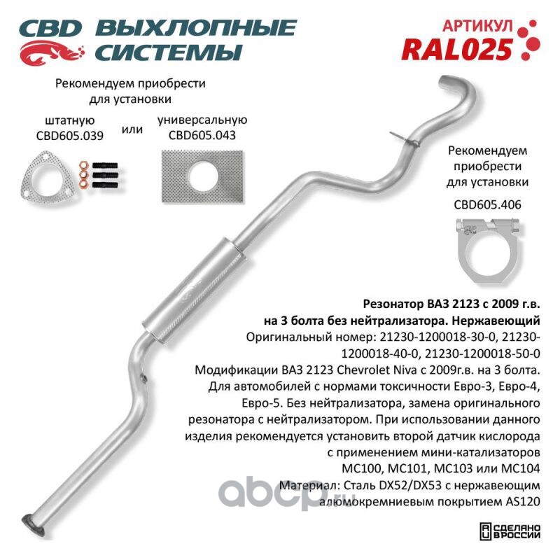 All World Cars - продажа Резонатор 2123 (3 отверстия) (2009-) с отв. под датчик кислорода, алюминиз. сталь артикул RAL025 по всей России и странах СНГ. Развитая сеть представительств с быстрой доставкой товаров бренда CBD и гарантией выгодной цены. Покупая в AWC товар CBD каталожный номер RAL025 вы бережете свое время, нервы и деньги.