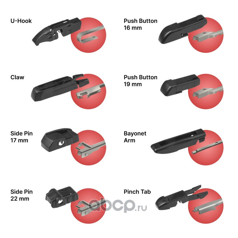 claw (клешня), j-hook (крючок), pinch tab (боковой зажим), push button (кнопка) 19мм, side mounting (боковое крепление), side pin (боковой штырь) 17мм, side pin (боковой штырь) 22мм