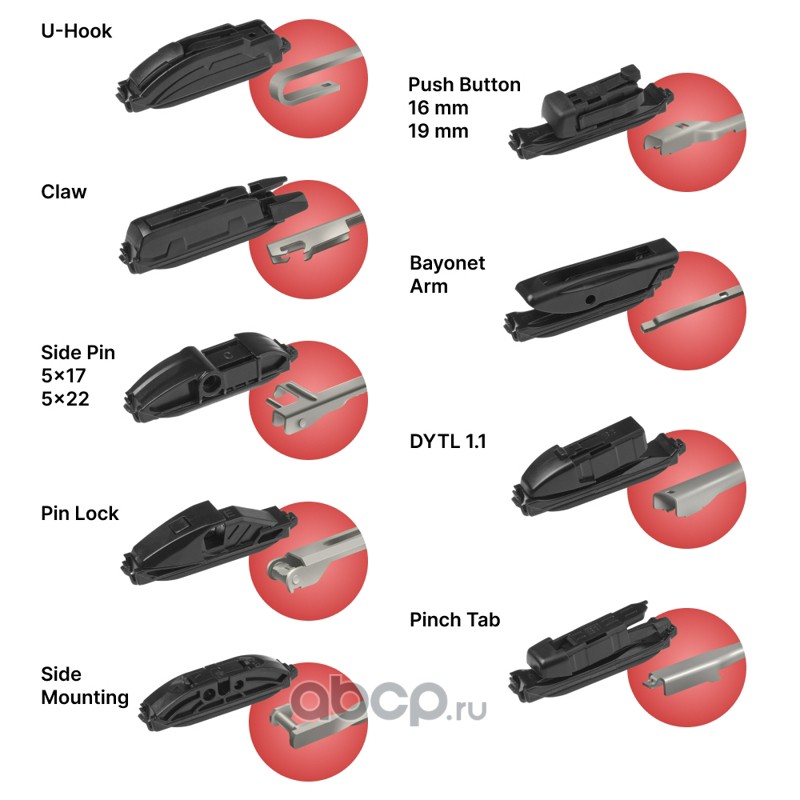 claw (клешня), j-hook (крючок), pinch tab (боковой зажим), pin lock (штырь), push button (кнопка) 19мм, side mounting (боковое крепление), side pin (боковой штырь) 17мм, side pin (боковой штырь) 22мм
