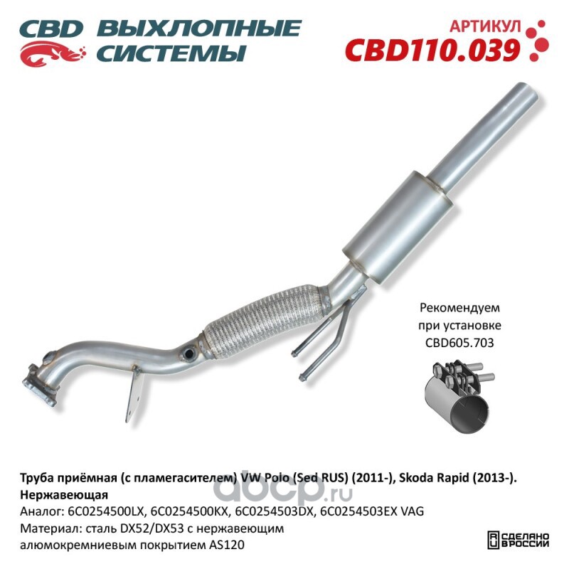 Глушитель приёмная труба(с катализатором Евро-4) Skoda Rapid/Volkswagen Polo 1,6 2015- |