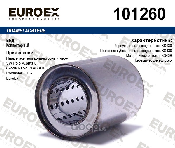 Расширенное описание: Пламегаситель коллекторный нерж. VW Polo V/Jetta 6, Skoda Rapid I/FABIA II/Roomster I 1.6 EuroEx