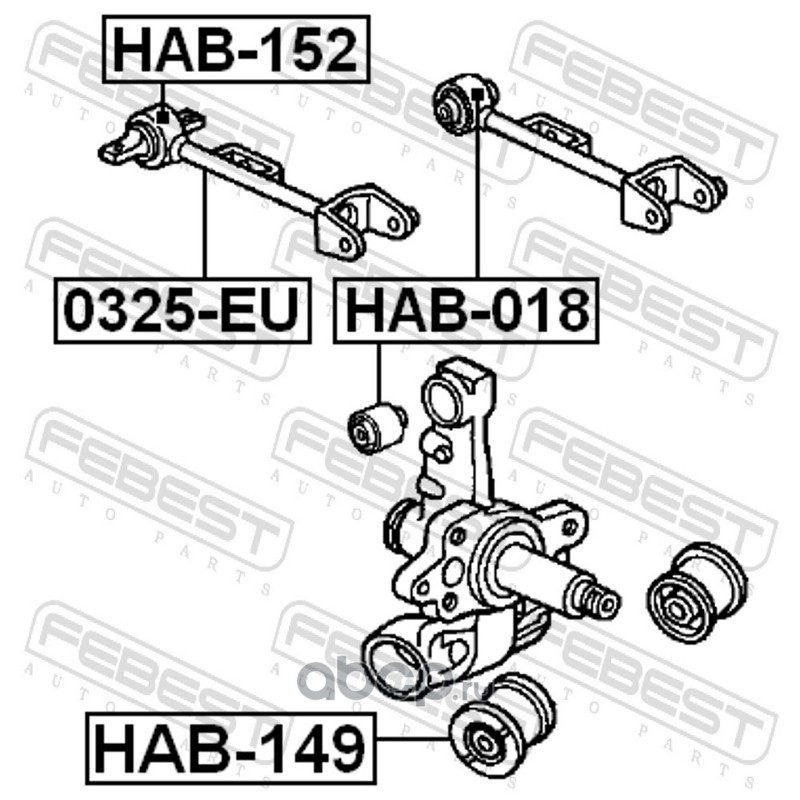 All World Cars - продажа Сайлентблок заднего рычага артикул HAB018 по всей России и странах СНГ. Развитая сеть представительств с быстрой доставкой товаров бренда Febest и гарантией выгодной цены. Покупая в AWC товар Febest каталожный номер HAB018 вы бережете свое время, нервы и деньги.