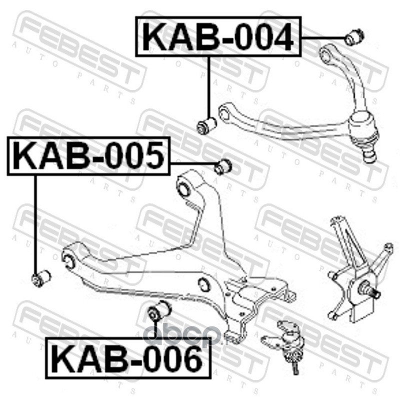 All World Cars - продажа с/б нижн. рычага внутр. артикул KAB005 по всей России и странах СНГ. Развитая сеть представительств с быстрой доставкой товаров бренда Febest и гарантией выгодной цены. Покупая в AWC товар Febest каталожный номер KAB005 вы бережете свое время, нервы и деньги.
