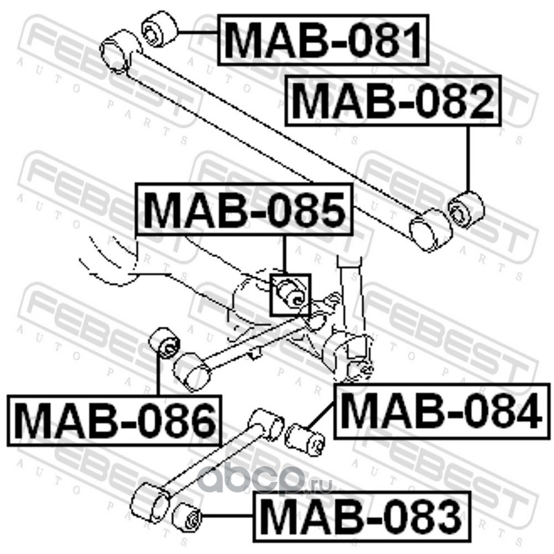 All World Cars - продажа Сайлентблок задней верхней продольной тяги артикул MAB086 по всей России и странах СНГ. Развитая сеть представительств с быстрой доставкой товаров бренда Febest и гарантией выгодной цены. Покупая в AWC товар Febest каталожный номер MAB086 вы бережете свое время, нервы и деньги.