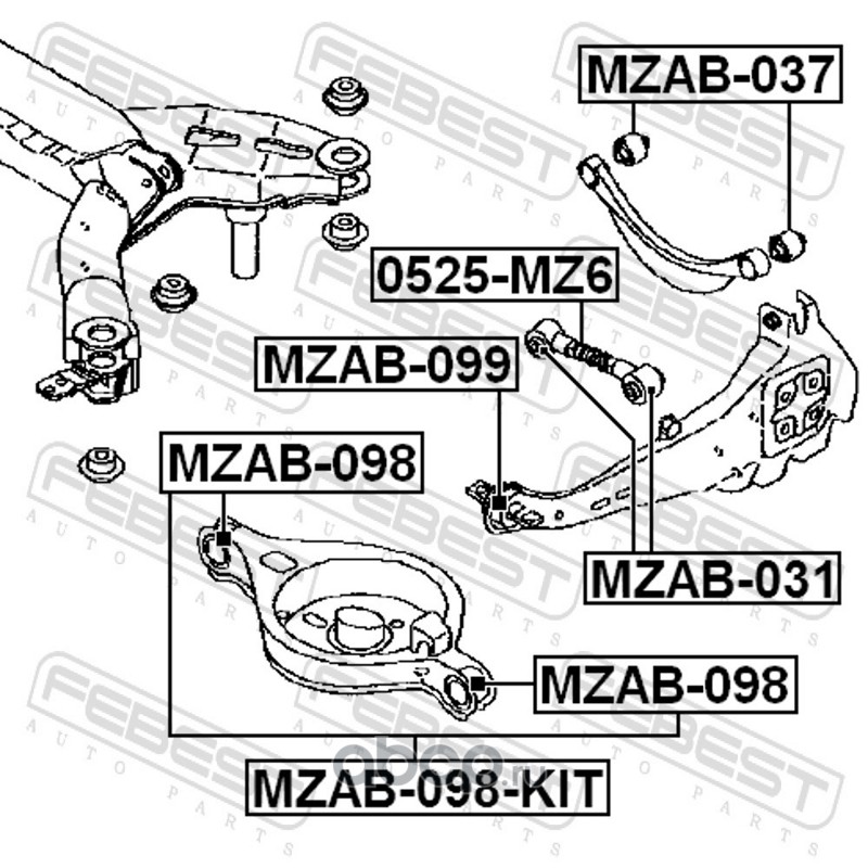 All World Cars - продажа Сайленблок заднего рычага комплект артикул MZAB098KIT по всей России и странах СНГ. Развитая сеть представительств с быстрой доставкой товаров бренда Febest и гарантией выгодной цены. Покупая в AWC товар Febest каталожный номер MZAB098KIT вы бережете свое время, нервы и деньги.