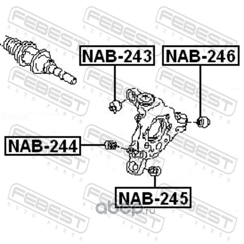 All World Cars - продажа Сайлентблок задней цапфы FEBEST NAB-243 артикул NAB243 по всей России и странах СНГ. Развитая сеть представительств с быстрой доставкой товаров бренда Febest и гарантией выгодной цены. Покупая в AWC товар Febest каталожный номер NAB243 вы бережете свое время, нервы и деньги.