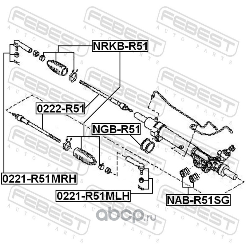 All World Cars - продажа Сайлентблок рулевой рейки (комплект) артикул NABR51SG по всей России и странах СНГ. Развитая сеть представительств с быстрой доставкой товаров бренда Febest и гарантией выгодной цены. Покупая в AWC товар Febest каталожный номер NABR51SG вы бережете свое время, нервы и деньги.