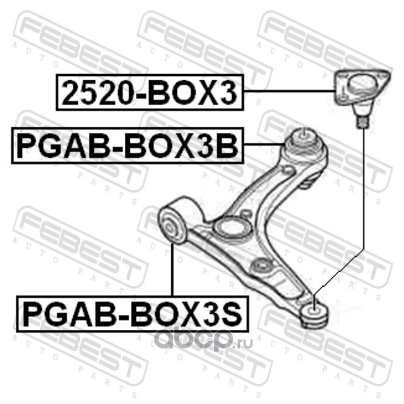 All World Cars - продажа Сайлентблок передний переднего рычага артикул PGABBOX3S по всей России и странах СНГ. Развитая сеть представительств с быстрой доставкой товаров бренда Febest и гарантией выгодной цены. Покупая в AWC товар Febest каталожный номер PGABBOX3S вы бережете свое время, нервы и деньги.