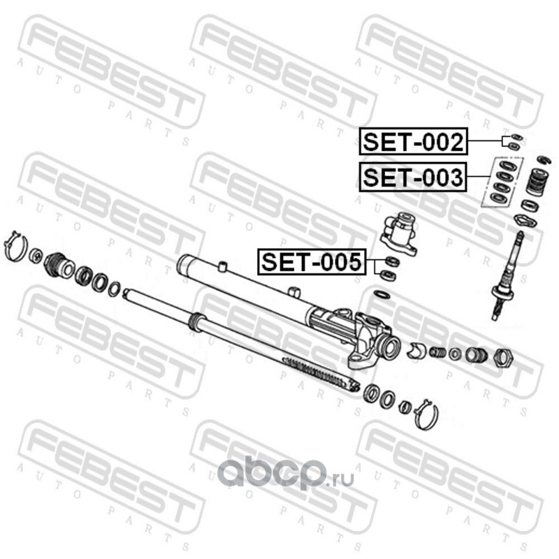 All World Cars - продажа Ремкомплект рулевой рейки артикул SET005 по всей России и странах СНГ. Развитая сеть представительств с быстрой доставкой товаров бренда Febest и гарантией выгодной цены. Покупая в AWC товар Febest каталожный номер SET005 вы бережете свое время, нервы и деньги.