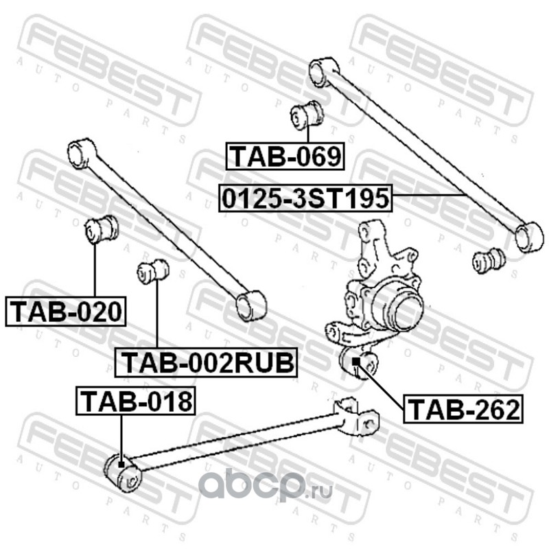 All World Cars - продажа Сайленблок задней цапфы артикул TAB002RUB по всей России и странах СНГ. Развитая сеть представительств с быстрой доставкой товаров бренда Febest и гарантией выгодной цены. Покупая в AWC товар Febest каталожный номер TAB002RUB вы бережете свое время, нервы и деньги.