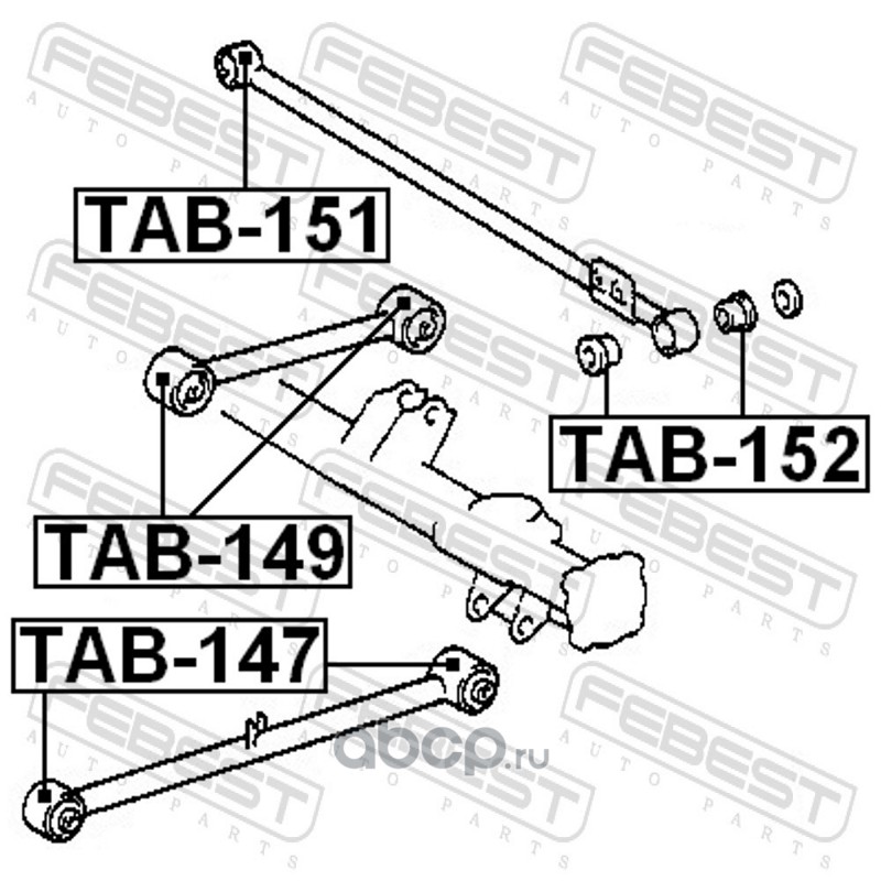 All World Cars - продажа Сайлентблок задний верхнего продолного рычага артикул TAB149 по всей России и странах СНГ. Развитая сеть представительств с быстрой доставкой товаров бренда Febest и гарантией выгодной цены. Покупая в AWC товар Febest каталожный номер TAB149 вы бережете свое время, нервы и деньги.