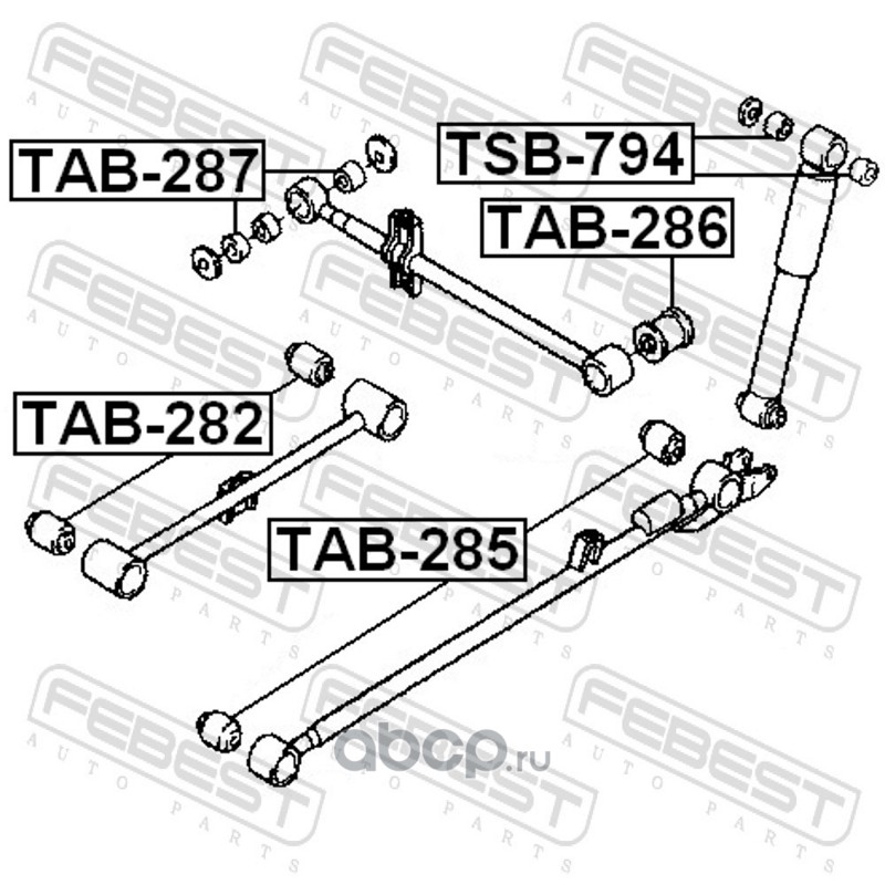 All World Cars - продажа Сайлентблок задн прод рычага DAIHATSU TERIOS 97-06 TAB-285 артикул TAB285 по всей России и странах СНГ. Развитая сеть представительств с быстрой доставкой товаров бренда Febest и гарантией выгодной цены. Покупая в AWC товар Febest каталожный номер TAB285 вы бережете свое время, нервы и деньги.