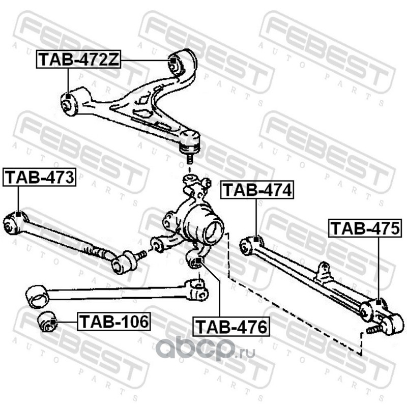 All World Cars - продажа Сайлентблок заднего поперечного рычага артикул TAB474 по всей России и странах СНГ. Развитая сеть представительств с быстрой доставкой товаров бренда Febest и гарантией выгодной цены. Покупая в AWC товар Febest каталожный номер TAB474 вы бережете свое время, нервы и деньги.