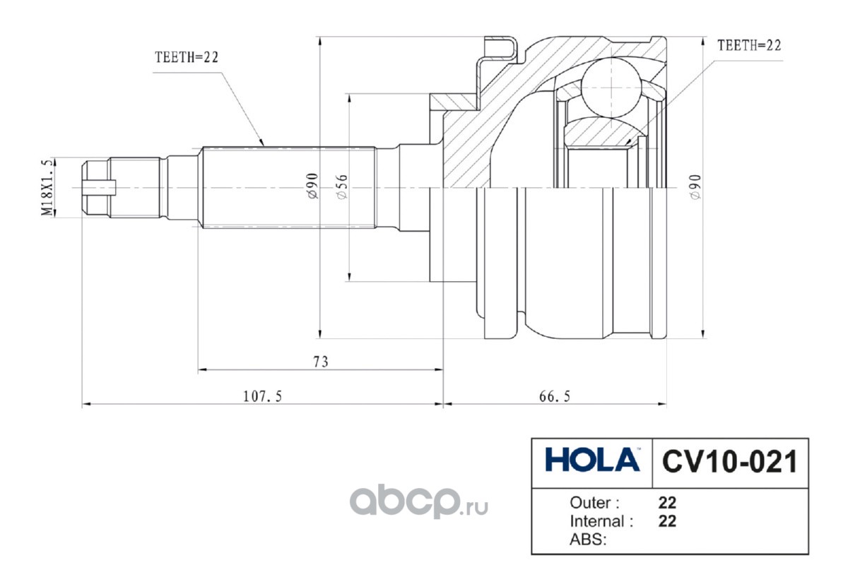 Расширенное описание: CV10-021=CV021, HOLA, ШРУС, наружный, левый/правый, 22 шлица, LADA Niva 2121, 4x4 до 2003г., (1шт.)