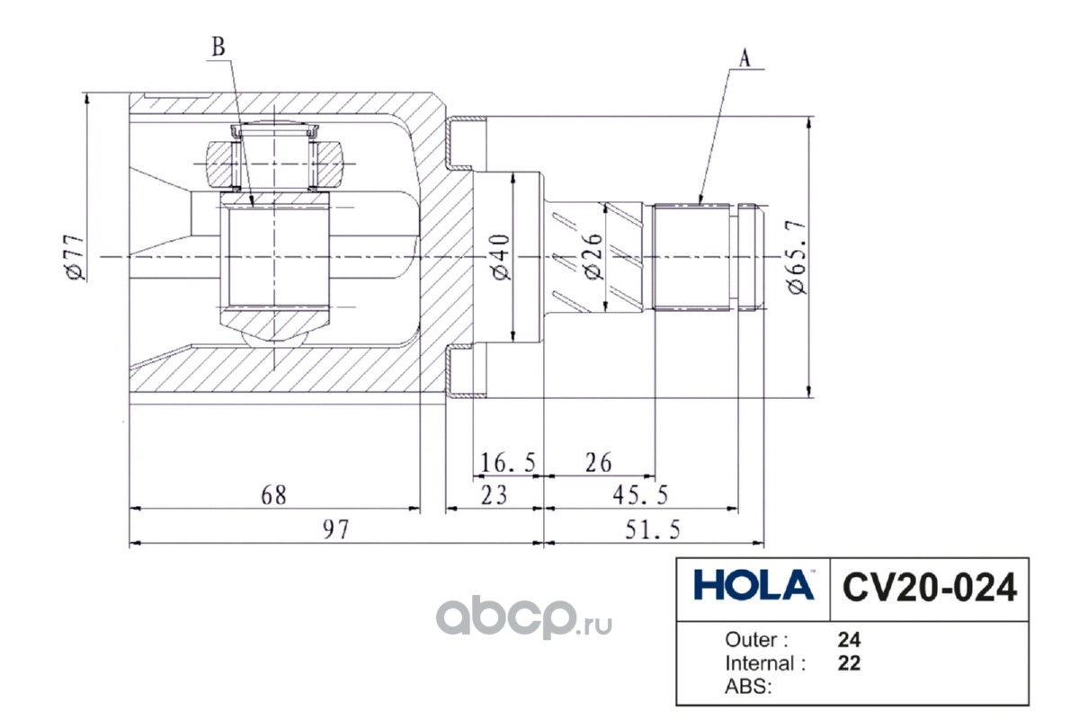 Расширенное описание: CV20-024, HOLA, ШРУС, внутренний, левый/правый, 24/22 шл., NISSAN Almera Classic (B10) 1.6 MT, (1шт.)