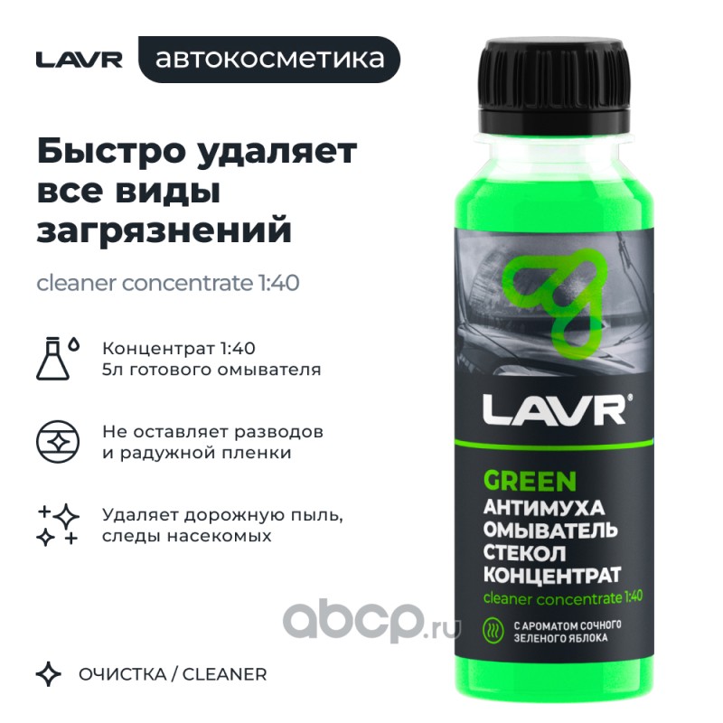 Расширенное описание: Нужен хороший летний омыватель стекол? Превратите обычную или дистиллированную воду в средство с прекрасными моющими способностями с концентратом Омывателя стекол Антимуха Green от LAVR. Экономично и эффективно! Состав разработан на основе качественных и проверенных компонентов, он не только справляется с загрязнениями, но и предохраняет систему омывания от коррозии и засоров. Плюс ко всему обладает легким яблочным ароматом.