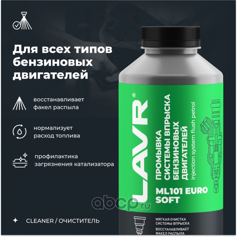 Расширенное описание: ML101 Euro устраняет до 100% загрязнений в форсунках благодаря запатентованному пакету моющих присадок LAVR ISP/DET™. Не требует замены масла и свечей. Применяется с промывочной станцией любого типа, подходит для всех типов систем впрыска бензиновых двигателей. Состав продукта соответствует европейским стандартам.