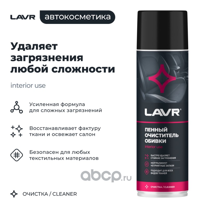 Расширенное описание: Хочешь привести в порядок салон? Используй Пенный очиститель обивки LAVR в удобном аэрозольном формате. Это проверенное средство для выведения пятен от сока, кофе, молока и губной помады, следов машинного масла и других видов загрязнений. Средство прекрасно подходит для ухода не только за салоном машины, но и для домашней и офисной мебели.